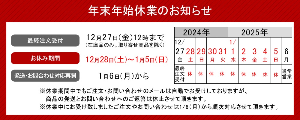 休業中にお受け致しましたご注文やお問い合わせは2025/1/6(月)から順次対応させて頂きます。
