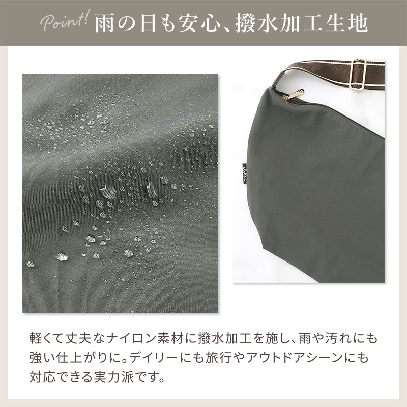 軽くて丈夫なナイロン素材に撥水加工を施しているため、急な雨や汚れにも強く安心です。