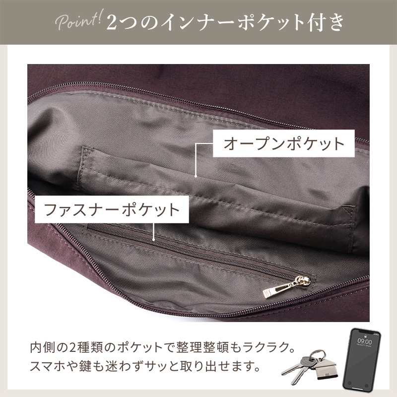 内側には、便利なファスナーポケットとオープンポケットの計2種類のインナーポケット付き。