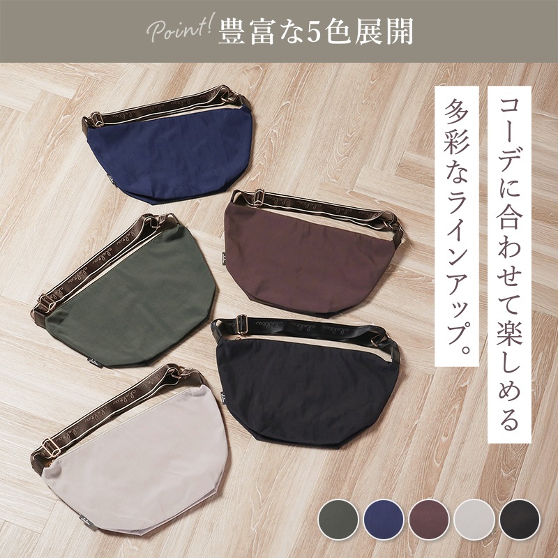 オリーブグリーン、ロイヤルネイビー、ココアパープル、サンドグレー、オフブラックの豊富な5色展開。