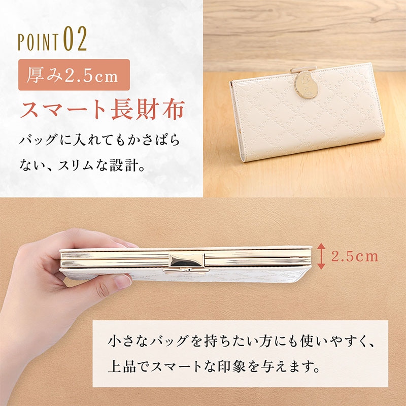 長財布の収納力はそのままに、バッグの中でかさばらない厚み2.5cmを実現。