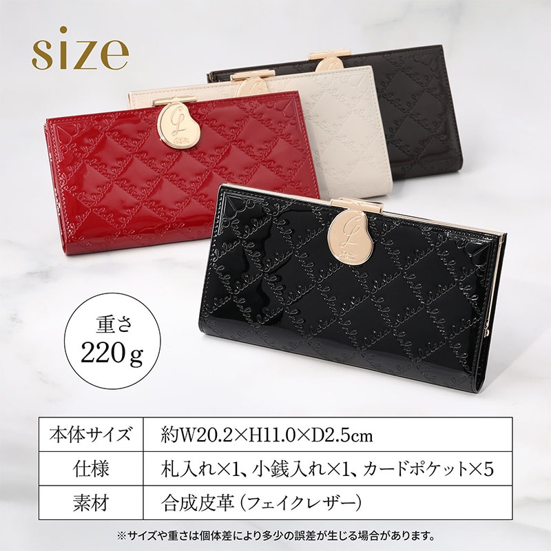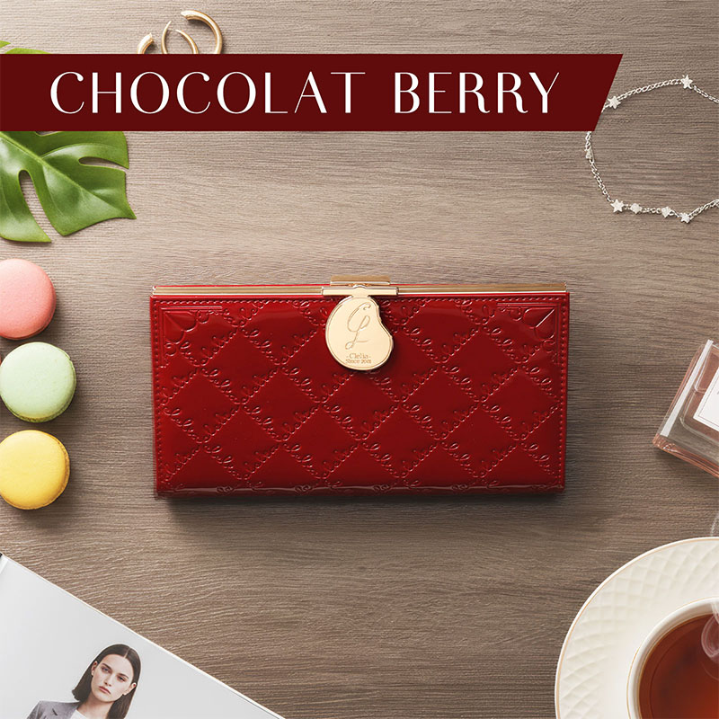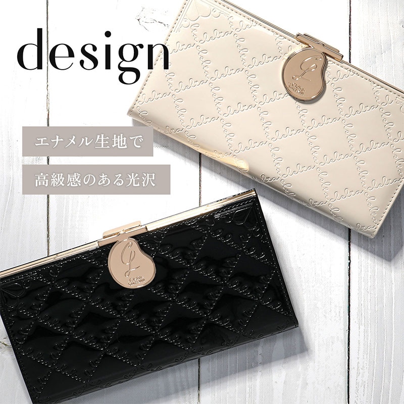 Cleliaのロゴを一面に型押しした、光沢が美しいエナメル長財布。